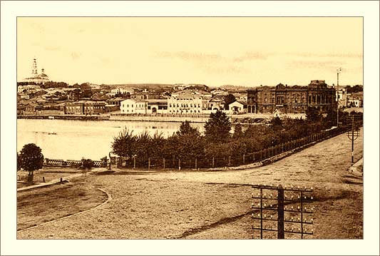 На переднем плане видна часть городской плотины и акватория городского пруда. В конце XIX - начале ХХ вв. городской пруд был одним из красивейших мест города. В чистой глади пруда отражались великолепные каменные здания, на северном берегу его находились дачи екатеринбургских купцов. Летом на пруду горожане катались на лодках, зимой здесь устраивался каток. Зимой на городском пруду специальные возчики добывали и поставляли для погребов горожан лед.